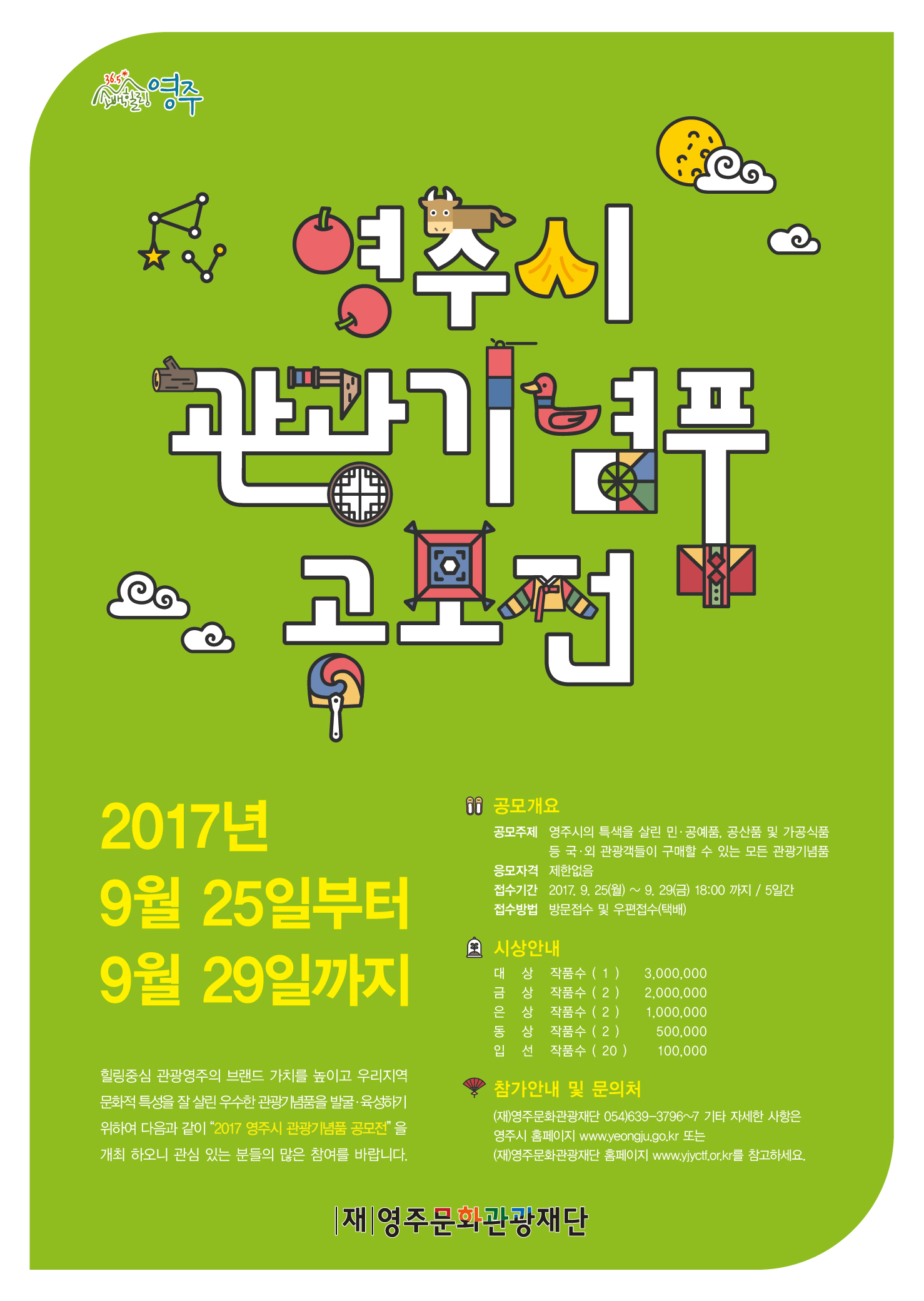 (재)영주문화관광재단 공고 제2017- 11호 2017 영주시 관광기념품 공모전 개최 공고 영주만의 특징을 살린 실용적이고 상품성이 우수한 관광기념품을 개발‧ 육성하고자 ⌜2017 영주시 관광기념품 공모전⌟ 개최하오니 관심 있으신 분들의 많은 참여 바랍니다.