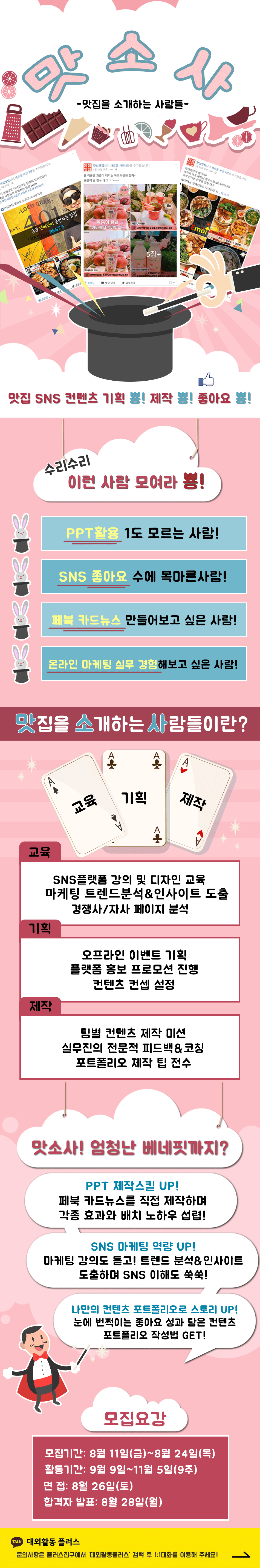 - 학교, 전공, 나이, 성별 불문 전국의 대학생이 모여 ' SNS마케팅' 을 체험합니다. 200여명의 대학생들과 함께 체계적인 커리큘럼 안에서 활동하실 수 있습니다. 더불어 20여명의 실무진들이 구체적인 피드백을 주시기 때문에 이를 통해 자신을 성장시킬 수 있습니다. 새롭고 재밌는 경험으로 자신을 성장시키고, 나만의 자소서 스토리를 만들고 싶은 대학생이라면 지금 바로 지원하세요!