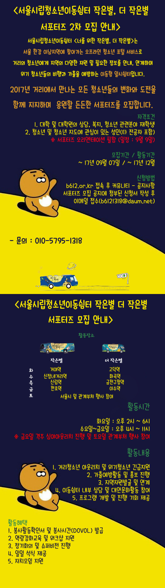 서울시립청소년이동쉼터 작은별&더작은별은 서울 한강 이남지역으로 청소년들에게 다양하고 필요한 서비스를 제공해주는 오프라인 청소년 포털입니다. 저희 작은별&더작은별에서는 청소년들에게 별★이 되어줄 서포터즈 ' 별지기' 를 모집하고 있습니다! 서포터즈는 작은별&더작은별의 일원으로서 청소년들에게 상담 등의 서비스를 제공하고, 매월 자치모임을 통한 다양한 프로그램 회의 및 재밌는 친목도모 시간!을 갖고 있습니다~ 또한, 서포터즈로서의 역량을 강화하도록 다양한 교육을 진행할 계획이오니 많은 관심 갖고 지원해주시기 바랍니다.