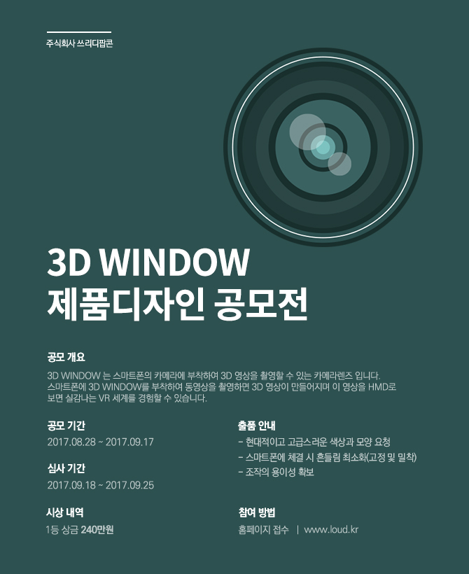 - 3D WINDOW 는 스마트폰의 카메라에 부착하여 3D 영상을 촬영할 수 있는 카메라렌즈 입니다. 스마트폰에 3D WINDOW를 부착하여 동영상을 촬영하면 3D 영상이 만들어지며 이 영상을 HMD로 보면 실감나는 VR 세계를 경험할 수 있습니다. 타겟층은 주로 청소년이라고 할 수 있으나 이에 한정하지 않습니다.