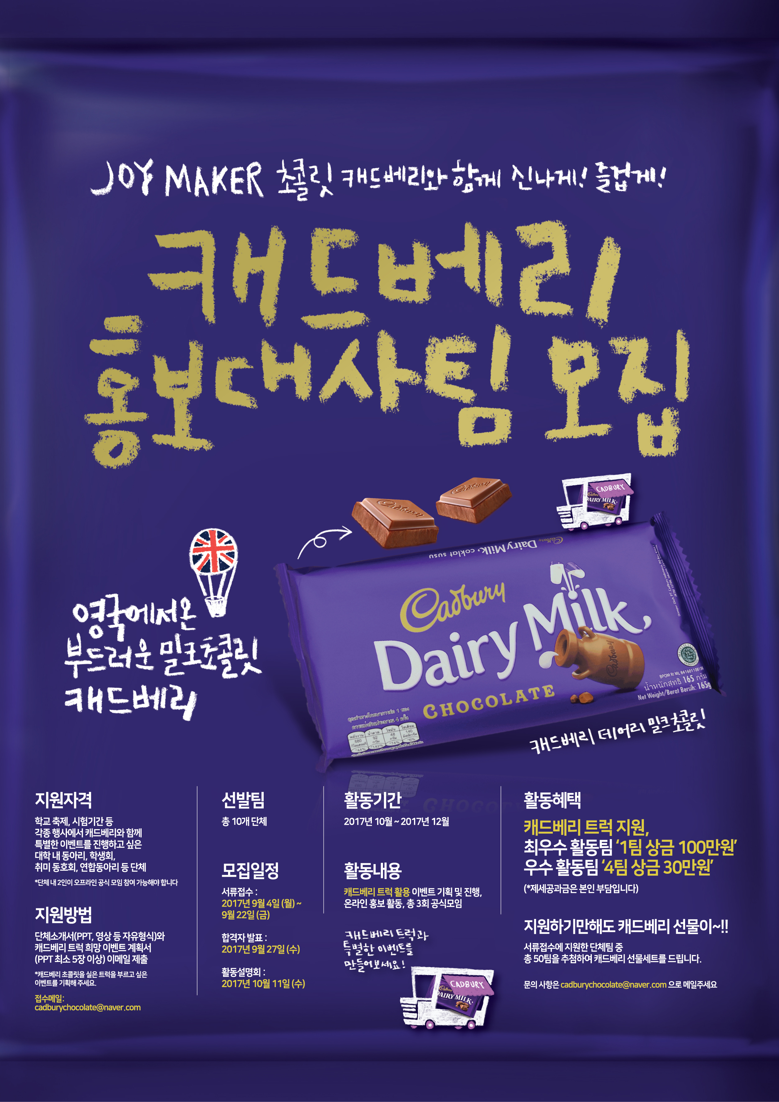 - 학교 축제, 시험기간 등 각종 행사에서 캐드베리와 함께 특별한 이벤트를 진행하고 싶은 대학 내 동아리, 학생회, 취미 동호회, 연합동아리 등 단체