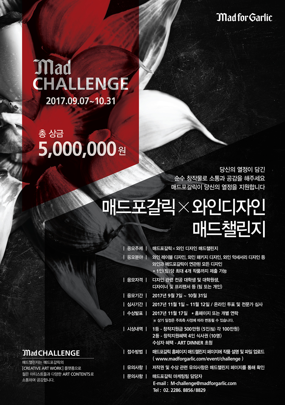 - 매드포갈릭 마케팅팀 담당자(Tel.02-2286-8856,8829 / E-mail. M-challenge@madforgarlic.com )