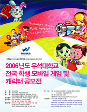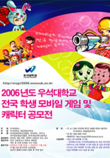 o 공모 내용 : 일반에 공개되지 않은 순수 디지털 컨텐츠로서 실제 상품 개발 가능한 형태로 작성된 모바일 게임 및 캐릭터 디자인 o 응모 부문 : 모바일 게임 부문 / 캐릭터 부문 (2d 또는 3d) (전라북도 전통문화 소재 캐릭터인 경우, 작품 소재 면에서 일부 가산점 부여) o 응모 자격 : 전국 고등학교나 대학교 재학생 개인 및 단체 (단체는 5인 이하) o 응모 기간 : 2006년 10월 16일 ~ 2006년 11월 3일 (11월 3일 등기우편 소인 유효) 단, 반드시 공모전 홈페이지(http://wsgc2006.woosuk.ac.kr) 에서 지원서 등록 후 우편 접수 o 시상 내용 대상 2편 (부문별 각 1편) : 전라북도지사상, 우석대학교총장상 및 상금 각100만원 최우수상 2편 (부문별 각 1편) : 상장 및 상금 각 50만원 우수상 4편 (부문별 각 2편) : 상장 및 상금 각 30만원 입선 (부문별 다수) : 상장 및 부상 * 우수상 이하는 고등학생과 대학생 부문을 별도 심사하여 시상 예정 o 수상작 발표 : 11월 15일 개인통보 및 공모전 홈페이지 (http://wsgc2006.woosuk.ac.kr) 에 게재 o 시상식 : 11월 17일 우석대학교 문화관 아트홀 o 입학 특전 수상자에게는 우석대학교 게임콘텐츠학과 입학에 가산점 부여. 단 우석대학교 신입생 선발 기준에 준함 o 수상작 전시 2006년 11월 17일 우석대학교 문화관 전시실 2006년 11월 17일 ~ 2007년 11월 16일 우석대학교 게임콘텐츠학과 및 공모전 홈페이지에 온라인 전시 o 응모 방법 공모전 홈페이지에서 지원서 및 작품요약서 양식 다운로드 > 공모전 홈페이지(http://wsgc2006.woosuk.ac.kr)에서 온라인 지원 등록 및 확인 > 제출 서류를 작성하여 우편으로 제출 o 접 수 처 : 우석대학교 게임콘텐츠학과 사무실 (063-290-1452, 1459) o 참 가 비 : 없음 o 우편접수 : (11월 3일 등기우편 소인까지 유효) (우)565-701 전북 완주군 삼례읍 후정리 490 우석대학교 게임콘텐츠학과 전국 학생 모바일 게임 및 캐릭터 공모전 담당자 앞