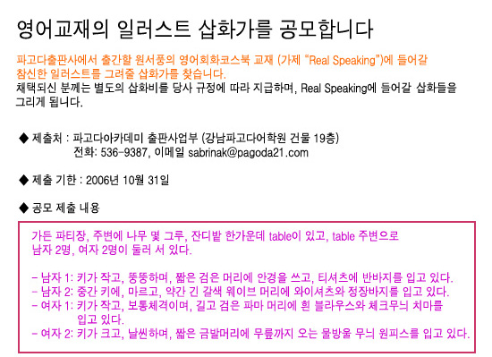 영어 회화 코스북의 일러스트를 모집합니다. 많은 응모 부탁드립니다.