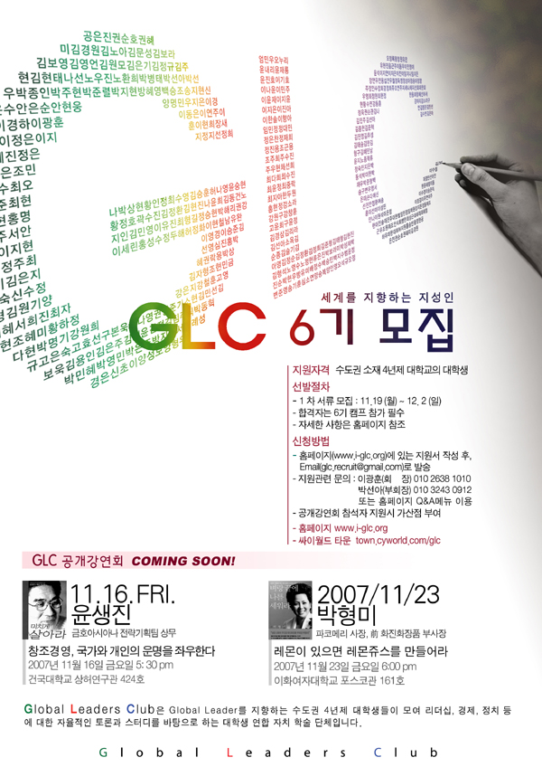 | ◎ 세계를 지향하는 지성인 global leaders club 6기 모집 ◎ 대학생 연합 자치 학술 단체 글로벌리더스클럽(glc)에서 제6기 회원을 모집합니다. glc는 global leader를 지향하는 수도권 4년제 대학생들이 모여 리더십, 경제, 정치, 사회 등에 대한 자율적인 토론과 스터디를 바탕으로 하는 대학생 연합 자치 학술단체 입니다. glc는 방학 중의 캠프, 학기 중의 스터디, 꼭 만나보고 싶었던 사회 각 층 연사들의 특강, 수도권 지역 35 개 대학의 회원들과의 인적 네트워크 형성, 산업시찰 등 대학생으로서 누릴 수 있는 다양한 활동들을 통해 당신의 대학생활을 한 층 풍요롭게 만들 수 있는 기회입니다. 세계를 지향하는 지성인들의 모임 glc에서 바로 당신을 기다립니다. 포스터의 마지막은 여러분의 이름으로 장식해주세요. ◆ 지원자격 - 수도권 소재 4년제 대학교의 대학생 (휴학생 지원가능) - 글로벌 리더를 향한 glc 활동(방학중 활동, 학기중 스터디)에 참여가능한 자 * 캠프 및 방중미션 참가 필수 ◆ 모집인원 70 명 ◆ 선발절차 - 1차 서류전형 07.11.19(월) - 07.12.02(일) - 1차 합격자발표 07.12.15토) ◆ 활동기간 - 6기 커리큘럼 : 2007년 1월~2007년 7월 - 최소 한 학기 이상 활동 ◆ 지원방법 1. 홈페이지(www.i-glc.org)에 있는 지원서 양식을 성심성의 껏 작성해주신 후, 각종증명서(필요 시) 스캔본과 함께 이메일로 접수하여 주시면 됩니다. e-mail : glc.recruit@gmail.com 2. gmail은 수신확인이 되지 않으니, 참고 바랍니다. 메일 발송 시 자동으로 회신이 되오니, 회신메일이 가지 않으신 분은 개별연락 바랍니다. 3. 파일명은 glc_이름_학교명 으로 접수하여 주시기 바랍니다. (정해진 파일명과 다를 시 불이익이 있을 수 있습니다.) ◆ 지원관련 문의 - 홈페이지(http://www.i-glc.org) q& a 게시판을 이용해 주세요. - 회장 이 광 훈 010-2638-1010 - 부회장 박 선 아 010-3243-0912 ◆ glc 설명회 및 릴레이공개강연회 * 6기 지원자 공개강연회 참석 시 가산점 부여 1. 첫번째 공개강연회 - 연사 : 윤생진 (금호 아시아나그룹 경영전략본부 상무,저서 미치게 살아라!) - 일시 : 2007.11.16(금) 늦은 5시 30분 - 장소 : 건국대학교 상허연구관 424호 - 주제 : 창조경영이 개인의 국가와 운명을 바꾼다. 2. 두번째 공개강연회 - 연사 : 박형미 (파코메리 사장, 전 화진화장품 부회장 ,저서 벼랑끝에 나를 세워라 !) - 일시 : 2007.11.23(금) 늦은 6시 - 장소 : 이화여자대학교 포스코관 161호 - 주제 : 레몬이 주어지면 레몬주스를 만들어라! ◆ glc소개 ◎ 설립목적 본 단체는 비정치적, 비영리적 순수 대학생 연합자치동아리로서 글로벌 리더가 되기 위한 자질을 함양하기 위해 연구, 노력, 실행하는 인재를 키우고 순수 학술활동을 추구함으로써 사회에 기여함을 목적으로 한다. ◎ glc비전 ▪ 올바른 리더십을 갖춘 인재 ▪ 국제적 감각을 갖춘 인재 ▪ 과거와 현재를 통해 미래를 내다볼 수 있는 통찰력을 가진 인재 홈페이지 : www.i-glc.org 싸이월드 타운 : http://town.cyworld.com/glc ================================================================ 세계를 지향하는 지성인 global leaders club ================================================================ |