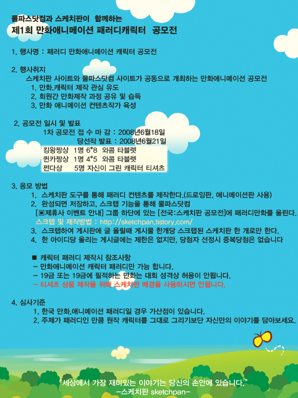 스케치판 사이트와 물파스닷컴 사이트가 공동으로 개최하는 만화애니메이션 공모전