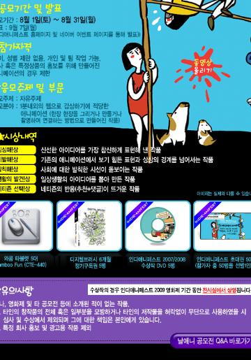 접수 기한: 2008년 8월 11일 ~9월 10일/네이버 날애니 공모전 페이지에 동영상 업로드