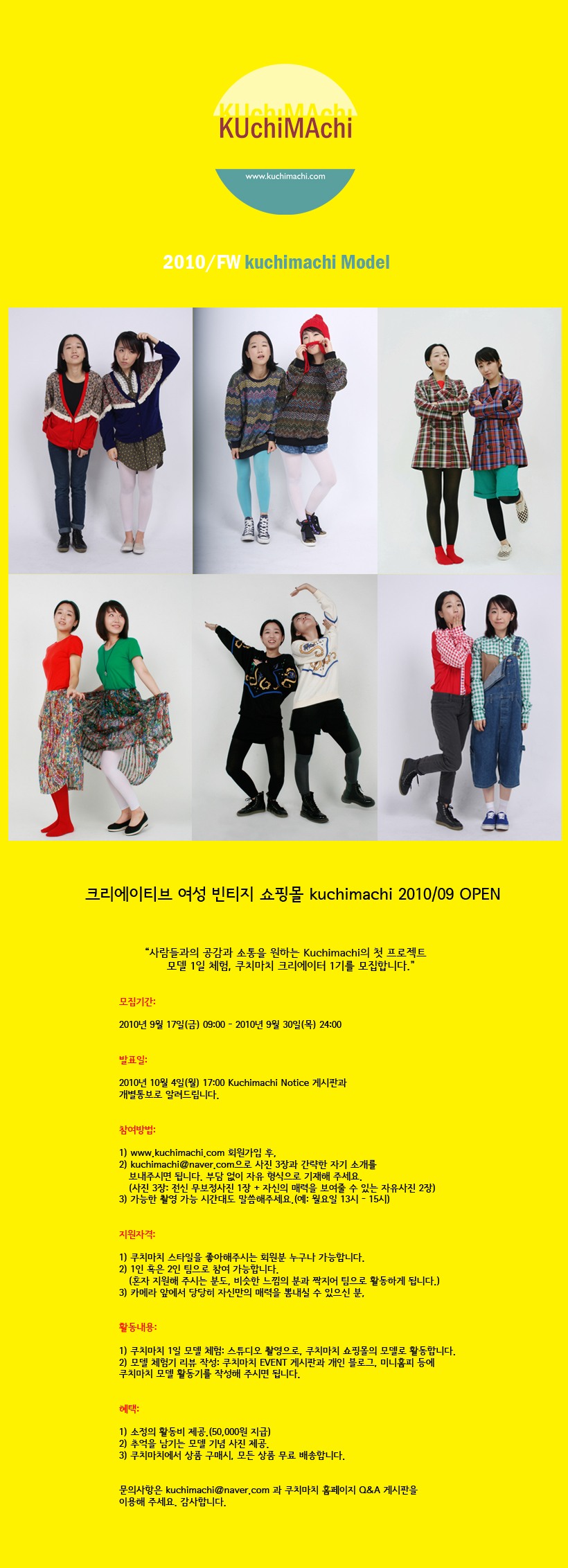 2) kuchimachi@naver.com 으로 사진 3장과 간략한 자기 소개를 보내주시면 됩니다. 부담 없이 자유 형식으로 작성해 주세요.