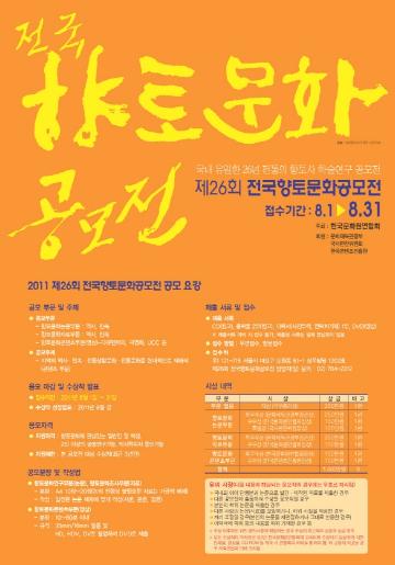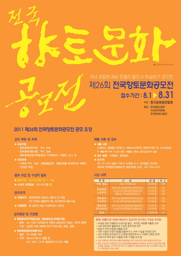 - 접수처: 우)121-715 서울시 마포구 도화동 51-1 성우빌딩 1202호 제26회 전국향토문화공모전 담당자(앞) 문의 02) 704-2312
