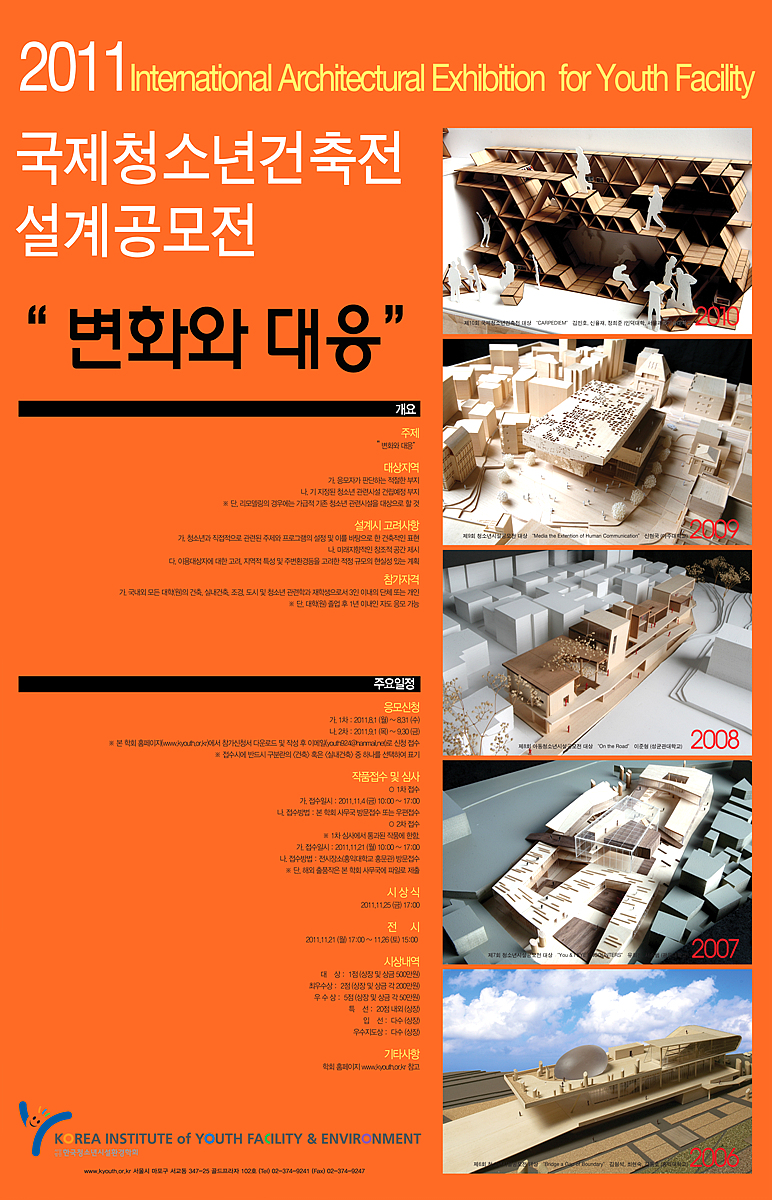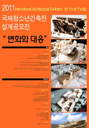 급격한 변모가 예상되는 미래사회 환경여건에 따라 청소년들을 위한 물리적 환경 또한 다양하고 새로운 요구의 국면에 부응해야 하므로, 본 한국청소년시설환경학회는 < 2011국제청소년건축전> 을 맞이하여, “변화와 대응”을 주제로 보다 창조적이고 다양한 모습의 미래지향적 청소년관련 건축공간들의 제시를 기대함
